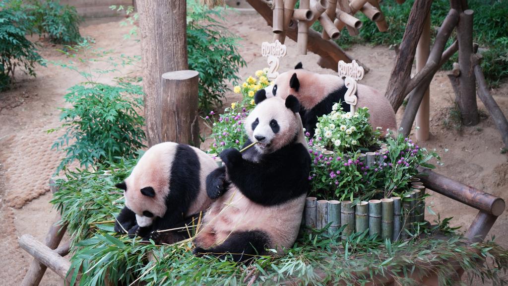 2025年7月7日,在韓國京畿道龍仁市愛寶樂園,大熊貓媽媽“愛寶”(中)和“睿寶”、“輝寶”在慶生活動(dòng)上享用美食。新華社發(fā)(孫一然攝)