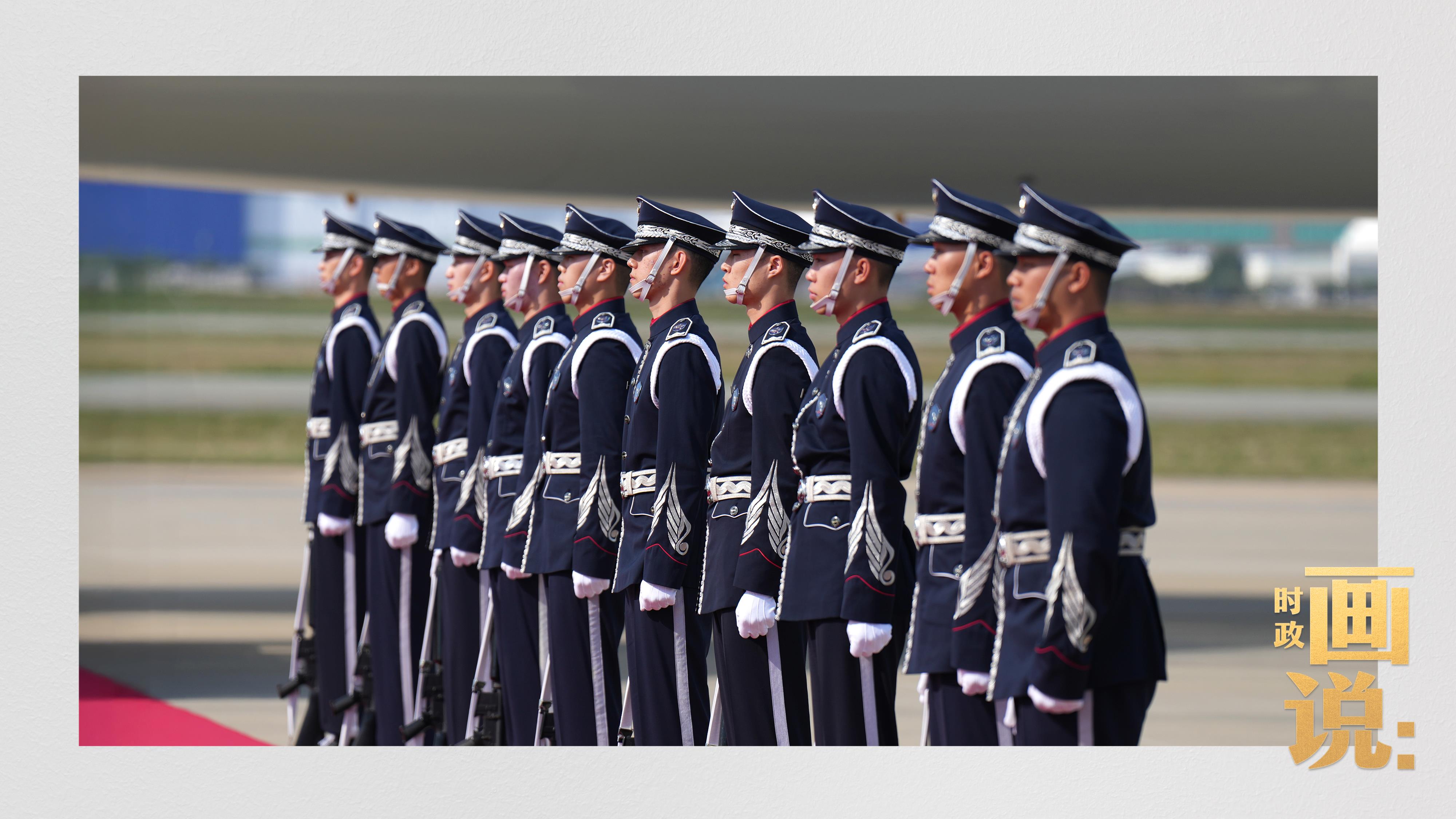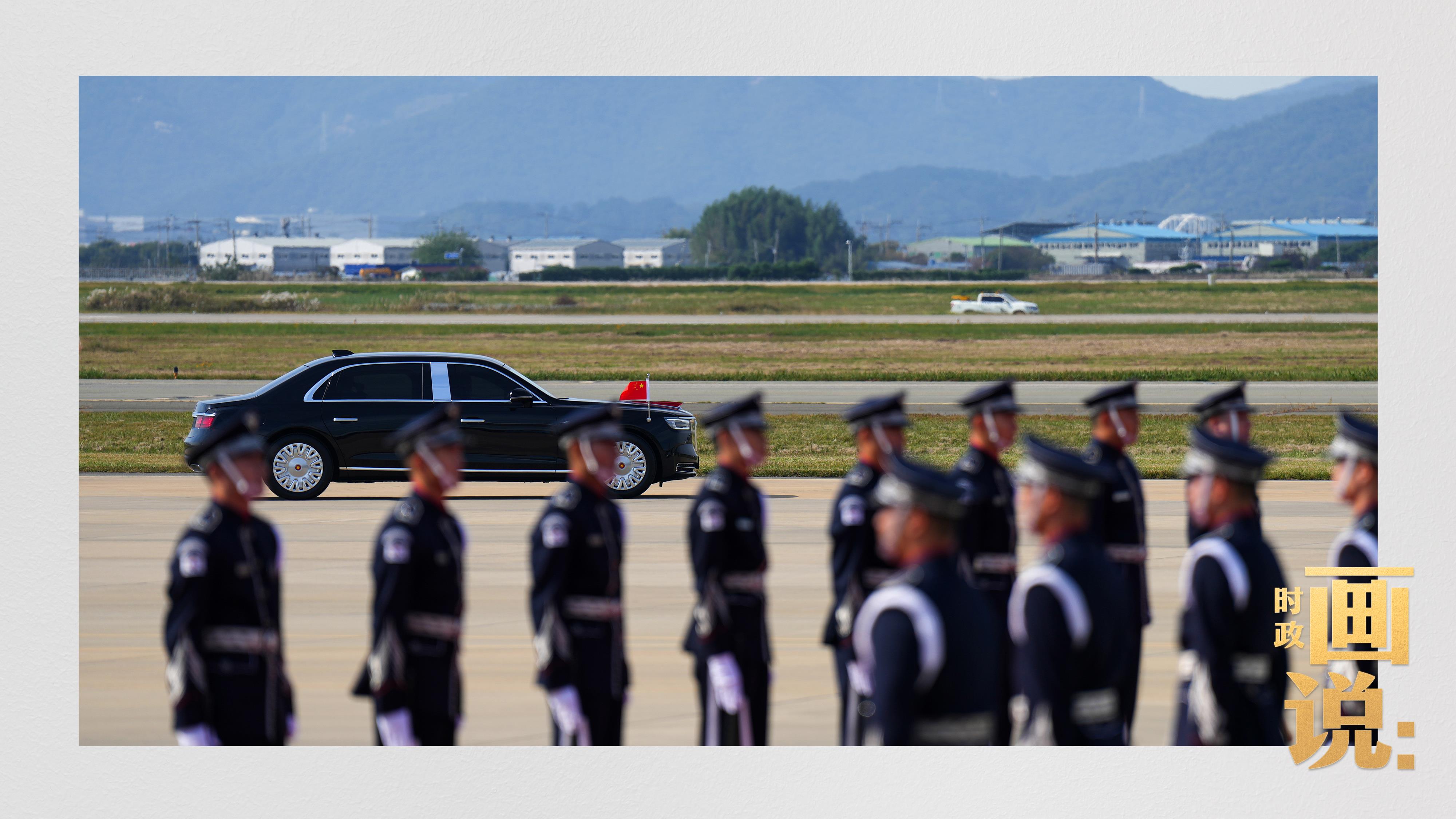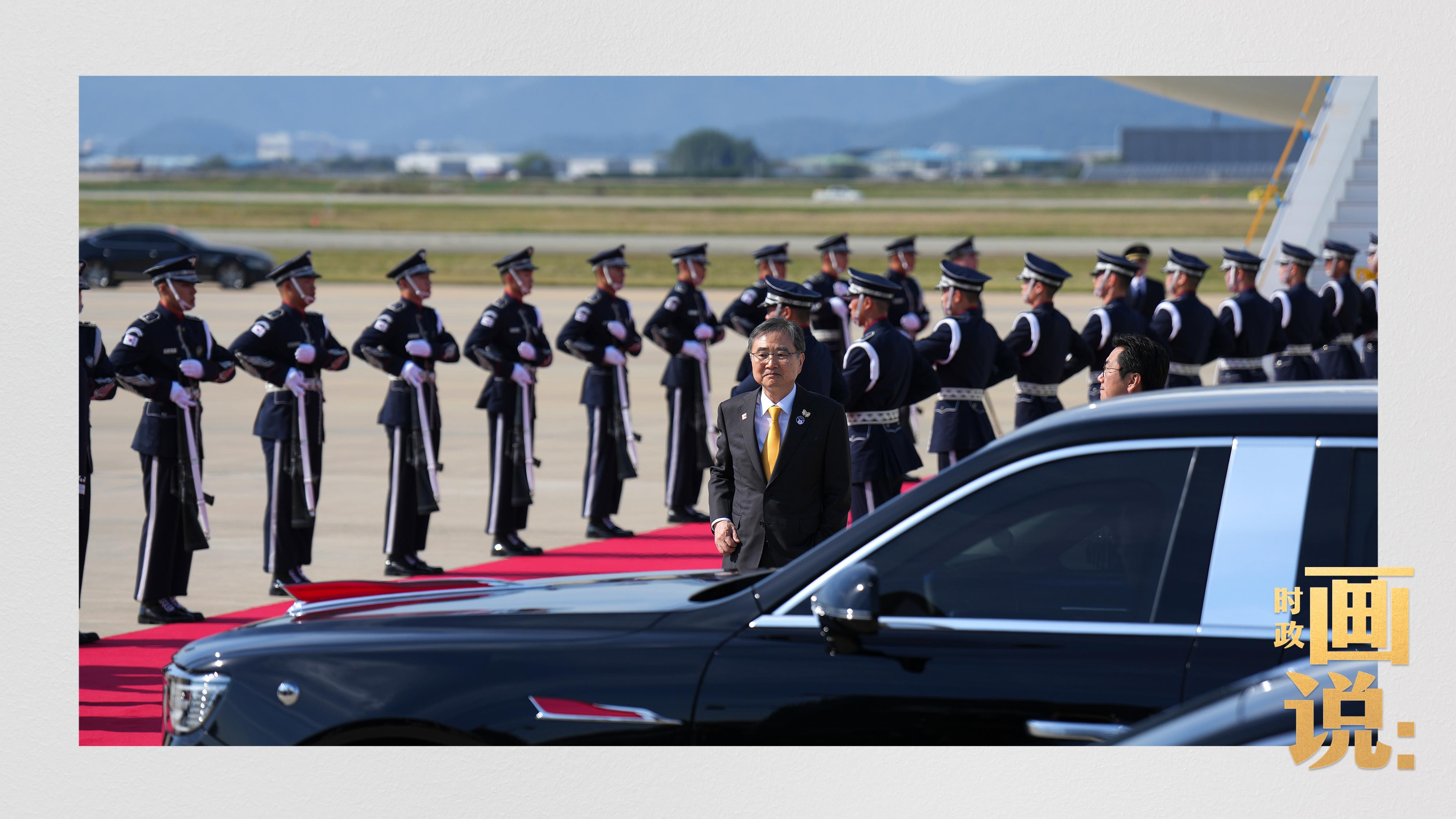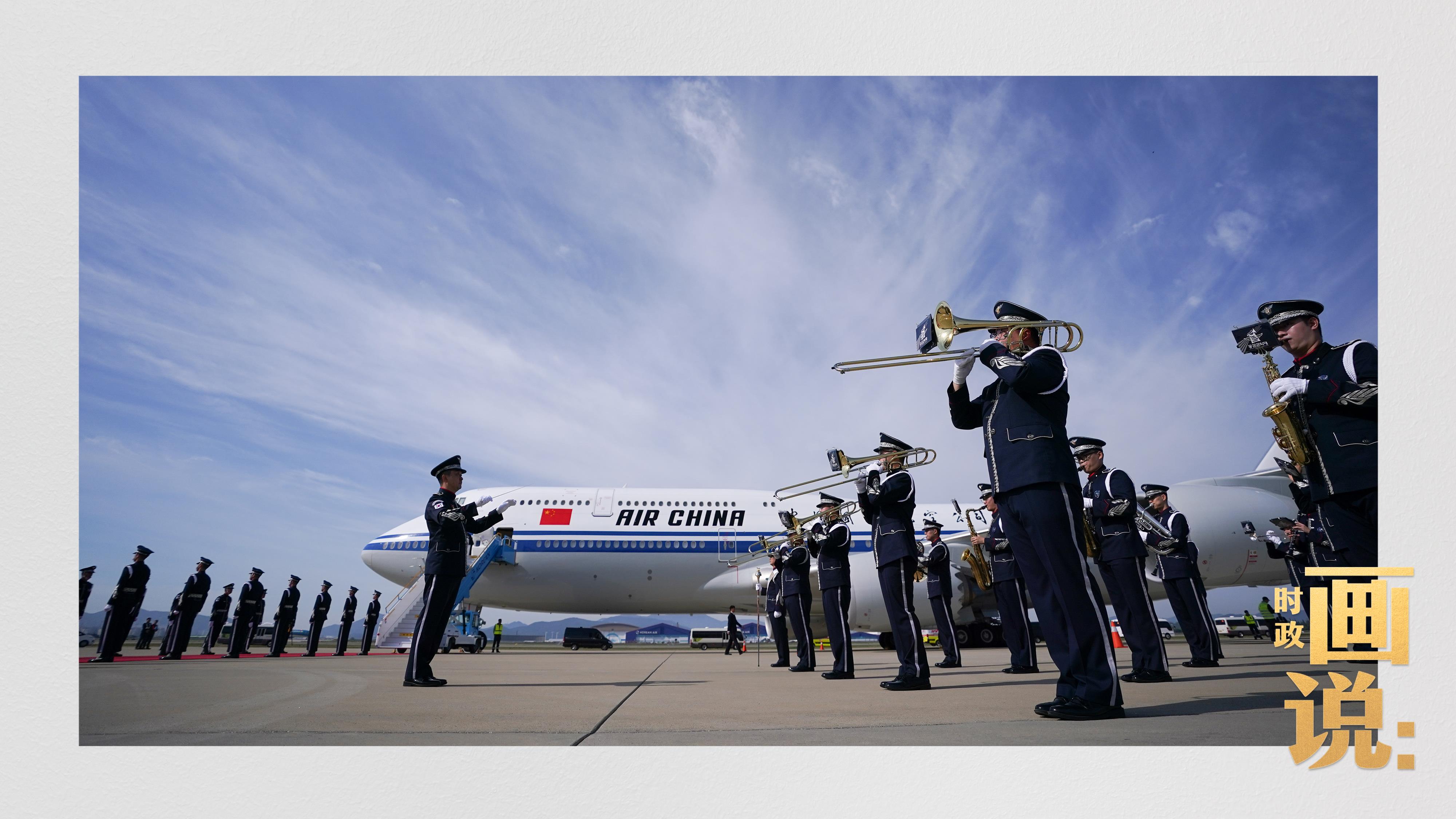 習(xí)近平抵達(dá)釜山金海國(guó)際機(jī)場(chǎng)時(shí),韓國(guó)外長(zhǎng)趙顯等高級(jí)官員熱情迎接。禮兵分列紅地毯兩側(cè)致敬,軍樂(lè)團(tuán)演奏行進(jìn)樂(lè),機(jī)場(chǎng)鳴放21響禮炮。