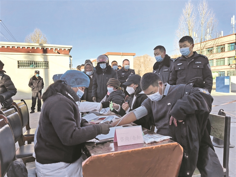 自2021年1月1日起,拉薩市在各縣(區(qū))設(shè)置26個新冠疫苗接種點,按照知情同意、自愿接種的原則,優(yōu)先對重點人群進行疫苗接種工作。圖為1日上午,在達孜區(qū)人民醫(yī)院,醫(yī)護人員正在對公安干警及群眾進行血壓檢測和詢問既往病史等,并與他們簽訂新冠病毒疫苗接種同意書。拉薩融媒記者 范江英攝
