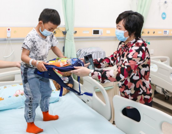 鄧莉副主任一行看望了來渝治療的15位患兒,并為他們送上嶄新的書包和文具。并與患兒家長熱情交談,詳細了解患兒恢復情況。患兒家屬代表卓瑪和旺姆分別向重慶市衛(wèi)健委和重醫(yī)附屬兒童醫(yī)院贈送了錦旗,并獻上了潔白的哈達表示感謝。