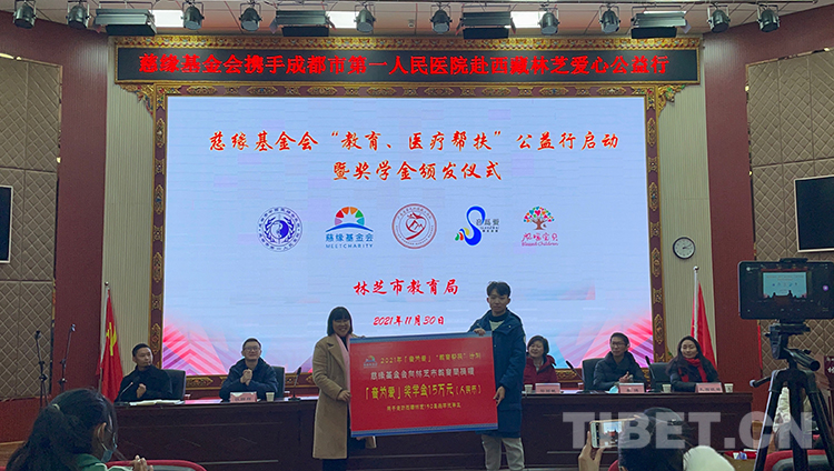 圖為慈緣基金會(huì)向林芝市教育局捐贈(zèng)15萬(wàn)元獎(jiǎng)學(xué)金 圖片由受訪者提供