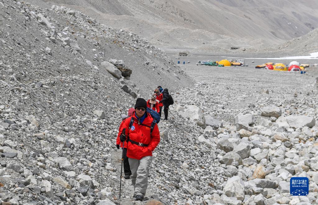 朱彤和科研人員在珠峰登山大本營和絨布冰川間徒步穿梭(5月1日攝)。新華社記者 姜帆 攝