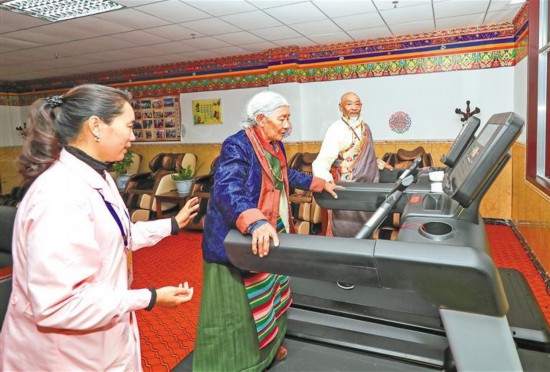 圖為在阿里地區(qū)噶爾縣老人集中供養(yǎng)中心,農(nóng)村特困老人在工作人員指導(dǎo)下進(jìn)行運(yùn)動(dòng)。記者 格桑吉美 攝