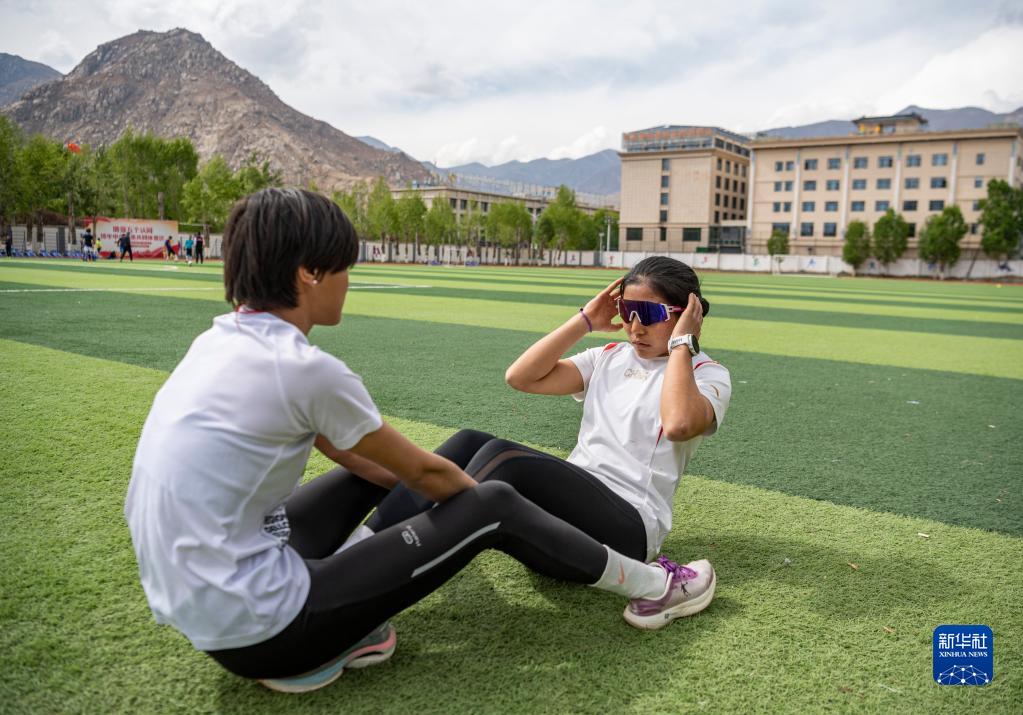 在西藏自治區(qū)體育運動技術學校,玉珍拉姆(右)在訓練中做仰臥起坐(4月29日攝)。新華社記者 孫非 攝