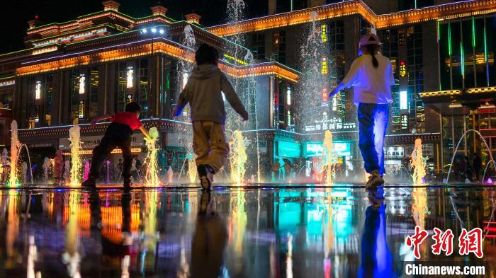 圖為孩子們在昌都市茶馬廣場噴泉附近玩耍。江飛波 攝