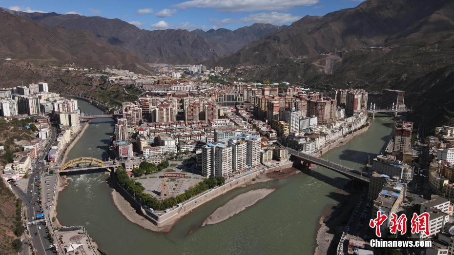 圖為航拍昌都城。瀾滄江正源扎曲河與昂曲河在此交匯為瀾滄江。中新社記者 蘇丹 攝