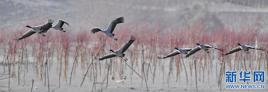 雅魯藏布江上飛舞的黑頸鶴(2月1日攝)。新華社記者 張汝鋒 攝