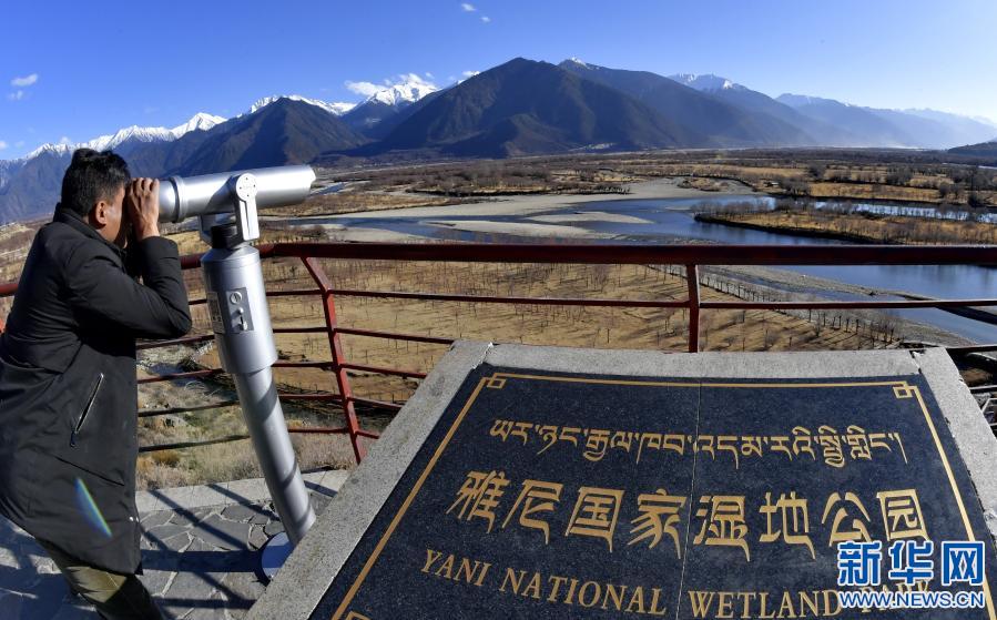 一名游客借助望遠(yuǎn)鏡觀看西藏雅尼國家濕地公園的景色(2月2日攝)。新華社記者 張汝鋒 攝