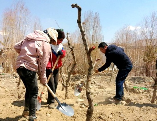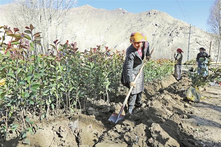 圖為拉薩市曲水縣才納鄉(xiāng)納木村村民正在房前屋后種植樹(shù)苗。