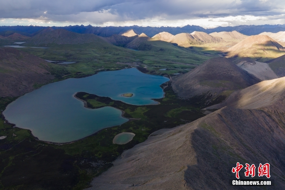 6月23日,思金拉措湖風(fēng)光秀麗。思金拉措位于西藏墨竹工卡縣日多鄉(xiāng),海拔4500多米,周邊群峰簇?fù)恚匦为q如聚寶盤,不少民眾將其稱為西藏的“財(cái)神湖”。(無(wú)人機(jī)照片) 中新社記者 江飛波 攝