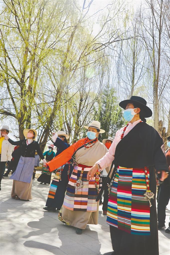 經(jīng)過春意潤染的城市,處處呈現(xiàn)出純凈明朗的美。布達(dá)拉宮的金頂反射著耀眼的金光,布達(dá)拉宮廣場前綠草茵茵,人工湖旁的垂柳被和煦的春風(fēng)吹得飄飄揚揚,羅布林卡里的古樹也開始抽出鮮嫩的枝葉,繁華的八廓街上,三五成群的轉(zhuǎn)經(jīng)老人坐在路邊歇息……