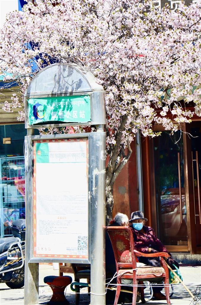 住在拉薩靠北邊的市民同樣能一飽眼福。娘熱北路兩側(cè)的榆葉梅已全部綻放,而緊鄰娘熱路的慈松塘中路和慈松塘東路更是一片春花爛漫的美好景象。慈松塘中路和北路的榆葉梅栽種較為密集,成團成簇的淡粉色花朵擠在枝頭,樹下乘涼的老奶奶、樹邊??康墓卉?,在花朵的加持下,隨手一拍便是故事感極強的畫面。