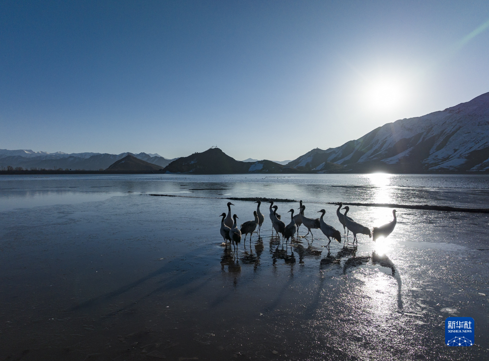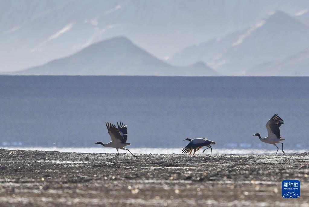 這是在拉薩市林周縣虎頭山水庫(kù)拍攝的黑頸鶴(3月1日攝)。新華社記者 張汝鋒 攝