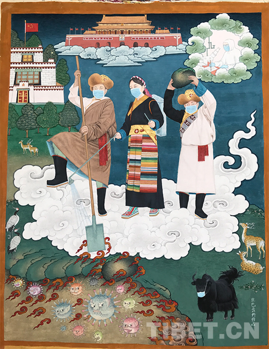 為什么要如此構(gòu)圖,旦巴云丹給出了解釋。新冠肺炎疫情發(fā)生以來(lái),全國(guó)人民都在用自己的方式和力量譜寫(xiě)撼天動(dòng)地的抗疫壯歌,身處雪域高原的人們也不例外。畫(huà)面中靠左的男子,揮舞著鐵鍬,想要把病毒掩埋;居中的藏族阿佳在噴灑消毒液;右邊的男子則想用大石塊將病毒粉碎。他們戴著口罩、身著藏族服飾,用不同的方式驅(qū)趕病毒,這是普通西藏群眾的心愿:希望早日消滅病毒。
