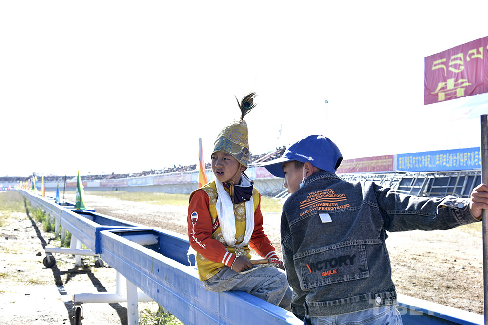 看了兩組比賽后,三兄弟奔跑到集合地點(diǎn),要準(zhǔn)備比賽了。看著哥哥拉巴桑珠和達(dá)瓦頓珠頭戴盔狀帽子、上穿黃色藏式上衣、手持竹把小鞭子,11歲的丹增久典滿是羨慕?!拔乙蚕腧T馬、去比賽,爸爸說還不到年齡?!?/p>