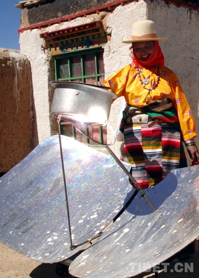 在藏北高原,現(xiàn)在隨處可見城鎮(zhèn)里的一個個太陽能路燈、一棟棟太陽能采暖樓和采暖房,一排排房頂上斜立著的太陽能熱水器,就連牧民家也常??梢钥吹桨卜旁诖扒?、屋頂和院內(nèi)的電池板、太陽灶。利用太陽能燒水做飯和發(fā)電照明,既方便又干凈,老天爺還不收燃料費。