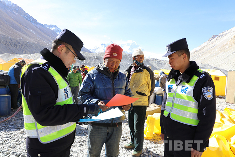 圖為在珠穆朗瑪峰大本營執(zhí)勤點(diǎn),民警開展普法宣傳 攝影:鄭勁松