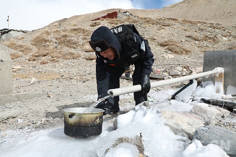 圖為執(zhí)勤點(diǎn)民警正在取水做飯 攝影:彭維熙