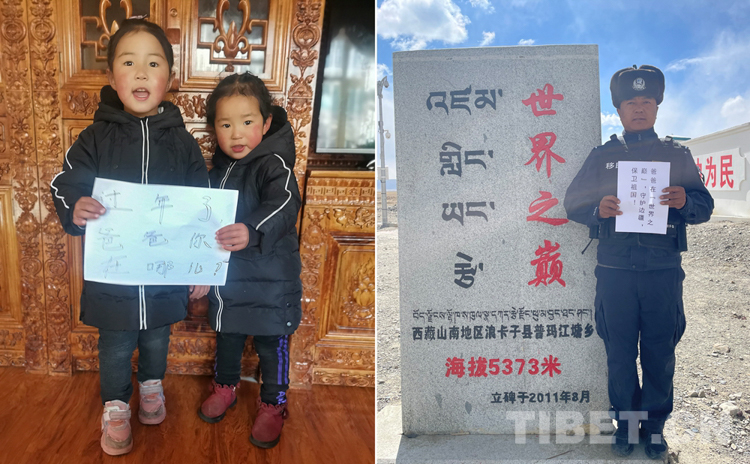 這是一張拼版照片,姐姐洛桑卓瑪,今年5歲,妹妹益西卓嘎,今年3歲。她們的父母——洛桑曲扎和索郎卓瑪,一個(gè)是浪卡子縣普瑪江塘鄉(xiāng)的移民管理警察,一個(gè)是山南市的特警,夫妻倆已經(jīng)三年沒(méi)有在家陪兩個(gè)女兒過(guò)年了。春節(jié)將至,洛桑曲扎堅(jiān)守在全國(guó)海拔最高的普瑪江塘邊境派出所,守護(hù)邊境,保衛(wèi)祖國(guó)。