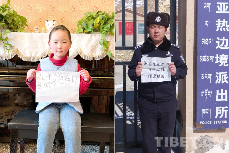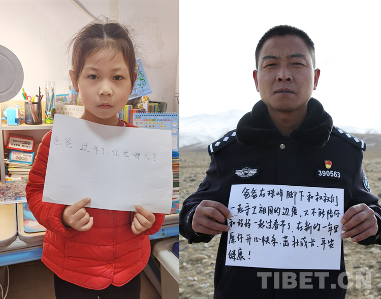 這是一張拼版照片,小女孩名叫旦增諾央,今年8歲,到現(xiàn)在還沒(méi)有和爸爸一起過(guò)過(guò)年。爸爸旦增尼瑪是日喀則邊境管理支隊(duì)亞熱邊境派出所所長(zhǎng),春節(jié)將至,他和戰(zhàn)友們堅(jiān)守在海拔5300多米的中尼邊境一線,他通過(guò)這種方式表達(dá)對(duì)孩子的思念,相信慢慢長(zhǎng)大的孩子一定能夠理解自己。