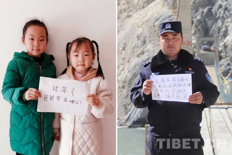 這是一張拼版照片,兩個(gè)小姑娘大的叫王源,今年9歲,小的叫王茂宣,今年6歲,兩個(gè)小姑娘至今只跟爸爸過(guò)過(guò)一次年,今年媽媽及外公外婆帶著她倆在四川瀘州過(guò)年。爸爸王忠禹是阿里邊境管理支隊(duì)底雅邊境派出所的移民管理警察,春節(jié)將至,他正和戰(zhàn)友們一起奮戰(zhàn)在邊境一線,為祖國(guó)守好邊、為人民站好崗。