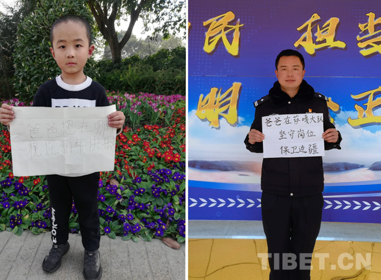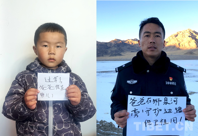 這是一張拼版照片,孩子名叫平措扎西,今年5歲,3年沒(méi)和爸爸一起過(guò)年了,今年和媽媽在日喀則過(guò)年。爸爸格瑪次仁是西藏出入境邊防檢查站阿里邊境管理支隊(duì)扎西崗邊境派出所民警,新春將至,他和他的戰(zhàn)友堅(jiān)守在海拔4400米、位于獅泉河下游的典角村,默默守護(hù)著邊境一線的安全穩(wěn)定。