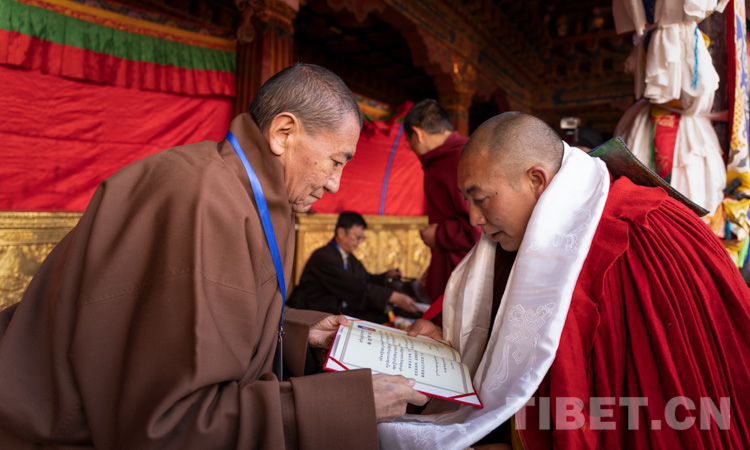 圖為中國(guó)佛教協(xié)會(huì)西藏分會(huì)常務(wù)副會(huì)長(zhǎng)珠康·土登克珠活佛(左)向考僧頒發(fā)學(xué)位證書(shū) 攝影:趙耀