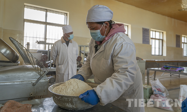 產(chǎn)品加工車間內(nèi),格桑南珠正在和高薪聘請的老師陳周祥一起加工糌粑餅干?!拔以谶@里工作快一年了,在老師的帶領(lǐng)下基本上能獨立完成糌粑餅干的加工生產(chǎn)了。這里工作一天有170元錢,比在家務(wù)農(nóng)的收入高多了?!?0歲的格桑南珠笑著說。