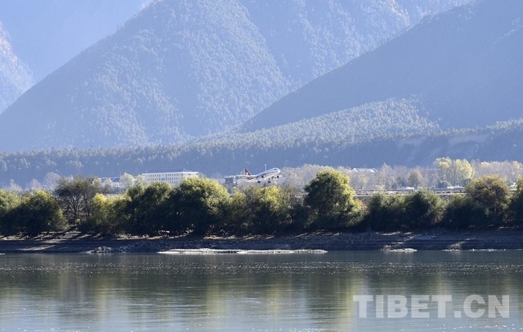 圖為2020年11月拍攝的一架飛機從西藏自治區(qū)林芝市米林機場起飛 攝影:王媛媛