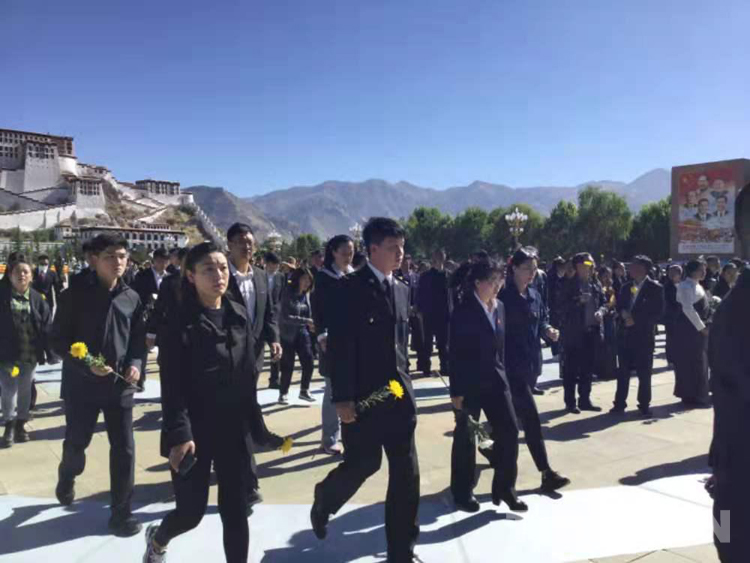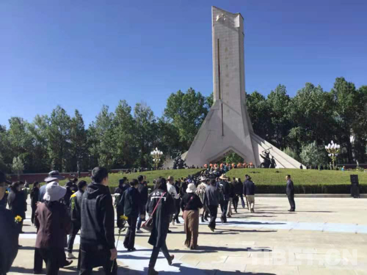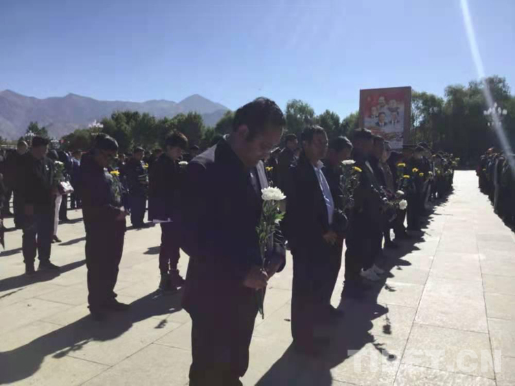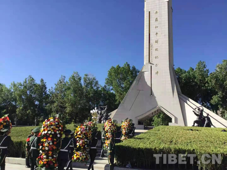 中共西藏自治區(qū)委員會(huì)、西藏自治區(qū)人大常委會(huì)、西藏自治區(qū)人民政府及各界群眾等分別敬獻(xiàn)的9個(gè)大型花籃一字排開,花籃紅色緞帶上書寫“革命先烈永垂不朽”8個(gè)金色大字。