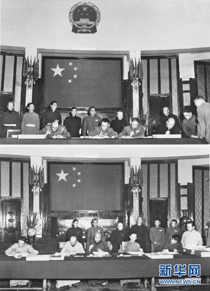 圖為1951年5月23日,中華人民共和國(guó)中央人民政府全權(quán)代表(上圖)和西藏地方政府全權(quán)代表(下圖)在《中央人民政府和西藏地方政府關(guān)于和平解放西藏辦法的協(xié)議》上簽字。上圖坐者右起為中央政府全權(quán)代表:李維漢、張經(jīng)武、張國(guó)華、孫志遠(yuǎn)。下圖坐者右起為西藏地方政府全權(quán)代表:阿沛?阿旺晉美、凱墨?索安旺堆、土丹旦達(dá)、土登列門、桑頗?登增頓珠。