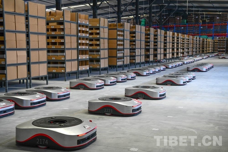 圖為西藏自治區(qū)級公共物流倉儲配送中心里,搬運(yùn)型機(jī)器人“地狼”投用