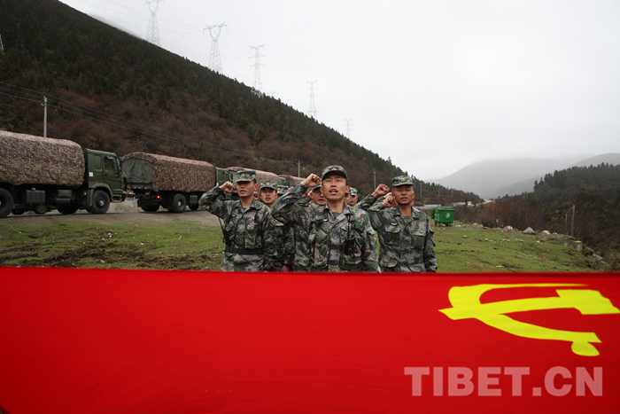 中國西藏網(wǎng)訊 近日,西藏軍區(qū)某運(yùn)輸旅執(zhí)行川藏線方向的運(yùn)輸任務(wù)車隊,到達(dá)迫龍?zhí)祀U時,開展了“重溫入黨誓詞、爭當(dāng)保障尖兵”活動?!拔抑驹讣尤胫袊伯a(chǎn)黨,我宣誓……”鏗鏘有力的誓言在崇山峻嶺中回蕩。