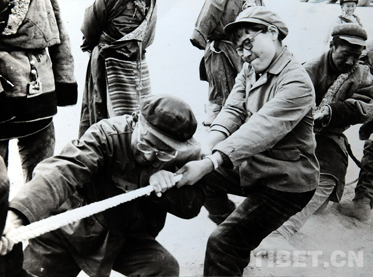 1976年盛夏,雙湖辦事處(現(xiàn)雙湖縣)副書記次仁玉珍(中)在進(jìn)行拔河比賽。這是西藏開發(fā)藏北無人區(qū)后,雙湖辦事處為拓荒者首次舉辦的體育活動(唐召明翻拍資料圖片)