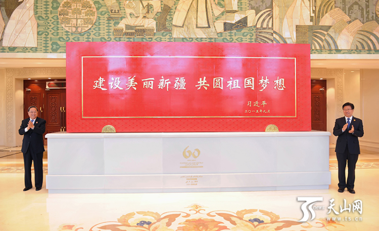 2015年9月25日,時任中共中央政治局常委、全國政協(xié)主席、中央代表團(tuán)團(tuán)長俞正聲和時任中共中央政治局委員、自治區(qū)黨委書記張春賢一同為習(xí)近平總書記題詞賀匾揭幕。攝影:新疆日報記者盧民一