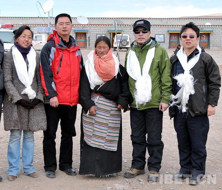 圖為中國石化第五批援藏干部、班戈縣副書記陳志清(左二)和常務(wù)副縣長潘峰(右一)專程到班戈縣新吉鄉(xiāng)接脖子下長著巨大腫瘤的牧女斯求卓瑪進(jìn)京治病時(shí),在鄉(xiāng)政府一同合影留念(王普2010年3月26日攝)