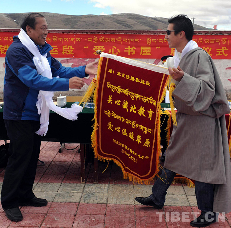 這是西藏那曲地區(qū)那曲縣(現(xiàn)那曲市色尼區(qū))羅瑪鎮(zhèn)中心小學(xué)校長拉巴格桑(右)代表學(xué)校向北京鐵路客運段代表王博軒(左)贈送錦旗(唐召明2014年5月29日攝)