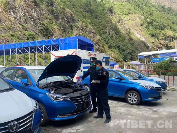 圖為拉薩海關(guān)關(guān)員驗(yàn)放出口車輛