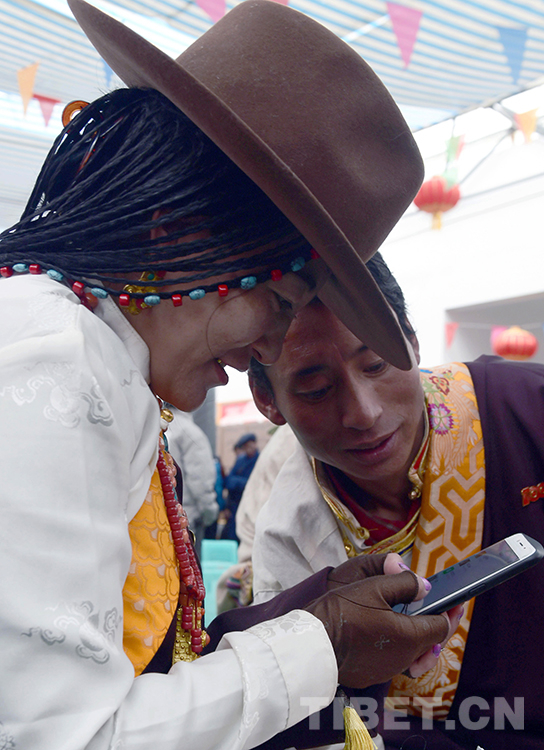 這是安多縣所在地帕那鎮(zhèn)的兩位著盛裝青年牧民在用手機(jī)了解外面的精彩世界(唐召明2021年9月15日攝)
