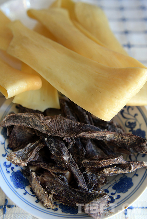 而“啦啦”,則是一種藏式奶酪,是一種高品質(zhì)奶制品?!袄怖病币话阌米髡写腿?,也是藏北逢年過節(jié)時的主要食品之一。這種用牦牛奶經(jīng)凝固而成的食物,基本上排除了牛奶中大量的水分,保留了其中營養(yǎng)價值極高的精華部分,被譽(yù)為乳品中的“黃金”。它味道香甜、乳香濃郁,很受人們喜愛,常泡在酥油茶中食用或出遠(yuǎn)門當(dāng)干糧,既解渴又充饑。