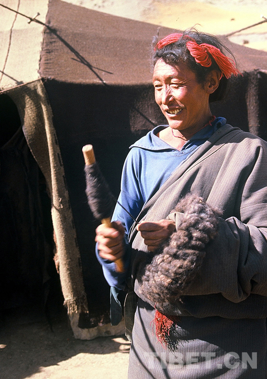 這是一名牧民男子在家中帳篷前捻用來織帳篷的牦牛線。過去牧民逐水草而居,住的是可以隨時拆遷的牛毛帳篷。如今,大多數(shù)牧民已住進(jìn)寬敞明亮的安居房,已很少自己捻毛線來織帳篷了(唐召明1987年攝)