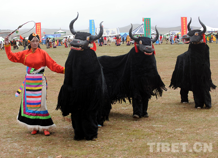 這是在那曲地區(qū)雙湖特別區(qū)(現(xiàn)那曲市雙湖縣)“撤區(qū)建縣”慶祝活動上表演的“牦?!蔽瑁ㄌ普倜?013年7月26日攝)