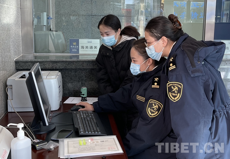 圖為拉薩海關(guān)關(guān)員現(xiàn)場指導(dǎo)企業(yè)辦理業(yè)務(wù) 圖片由拉薩海關(guān)提供