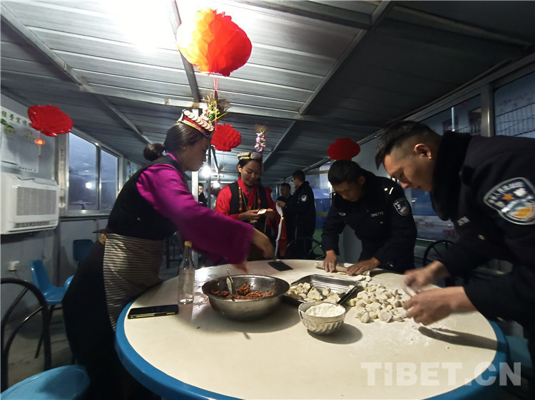 “阿久(藏語音譯:大叔),包餃子得講究手法,你要把餡放皮中央。”民警陳國云邊講解邊演示,一個(gè)個(gè)餃子范本整整齊齊擺在托盤上。香腸、臘肉、餃子、羊肉、雞湯、糌粑、火鍋.....一桌藏漢式的年夜飯準(zhǔn)備完畢,大家圍坐在圓桌旁,舉杯共祝新春,濃濃的年味兒在夏爾巴第一村溢出,教導(dǎo)員康林感嘆道:“雖然春節(jié)不能回家,但是我們就是一個(gè)大家,祝大家新年快樂,扎西德勒!”