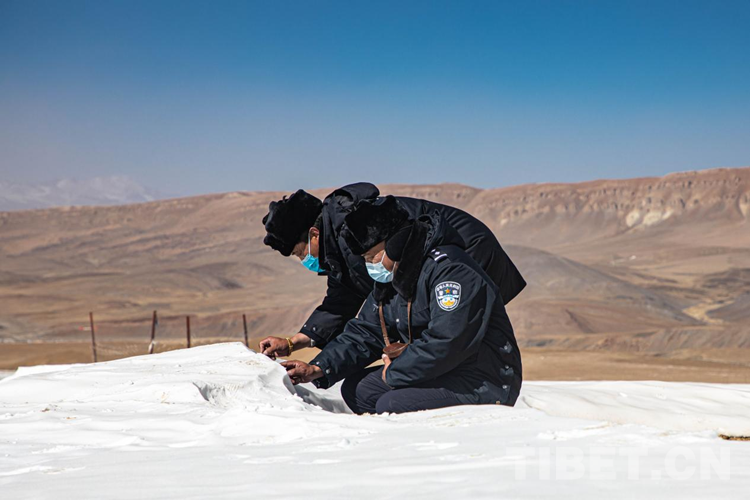 到達(dá)踏查點(diǎn),那里有一個(gè)由大小差不多的石頭壘起來(lái)、高50厘米左右的半圓形石堆,這就是他們踏查的避風(fēng)港。普瓊手執(zhí)國(guó)旗佇立在石頭上,嘎色拿出胸前的望遠(yuǎn)鏡,觀察四周有無(wú)異樣。風(fēng)不停地襲擾,但他們就像雕塑一樣,誓死捍衛(wèi)著腳下的領(lǐng)土。