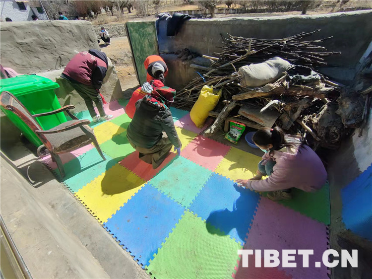 圖為黨員們在羅布次仁家的地面上鋪滿厚厚的墊子