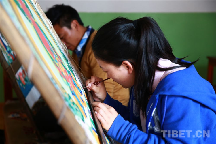 圖為西藏唐卡畫(huà)院中正在學(xué)習(xí)繪畫(huà)技術(shù)的年輕人 攝影:許娜