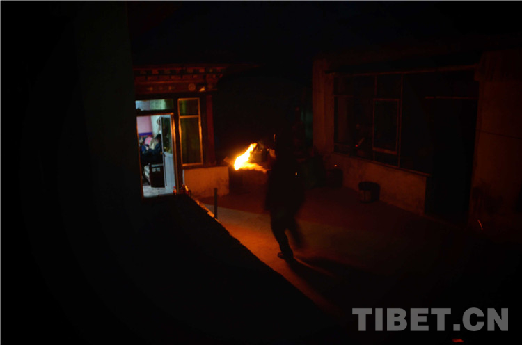 酒足飯飽后,“驅(qū)鬼”儀式開始。家人們一起各自用糌粑從頭到腳觸碰一遍、捏下手印后,與故意吃剩的一點古突扔進驅(qū)鬼盤,寓意將身心中的病痛與不詳全部拋掉。隨后查斯點燃火把,一邊喊著“所有妖魔都出去”,一邊手持火把跑往所有屋子各掃幾下,拿著火把和驅(qū)鬼盤到交叉路口焚燒掉。一路狂奔,且不能回頭。