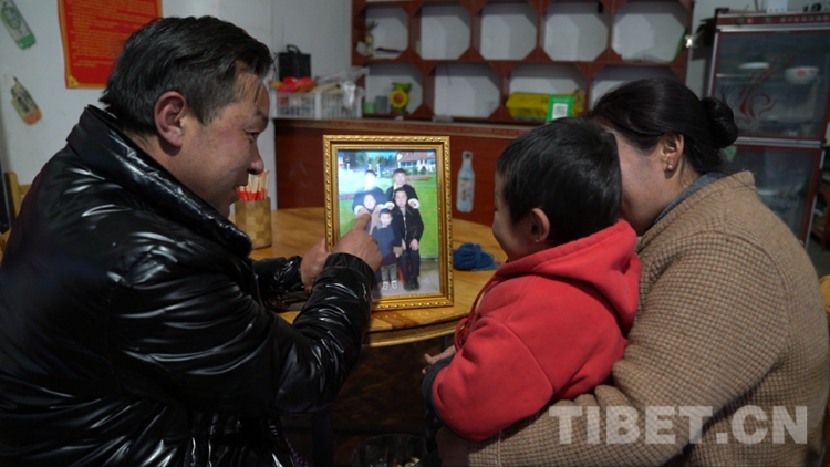 圖為民族團(tuán)結(jié)家庭趙以存給小兒子看一家五口的全家福