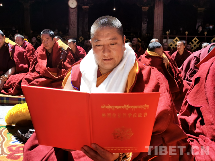 活動現(xiàn)場,西藏自治區(qū)人民政府副秘書長馬立柱代表西藏自治區(qū)人民政府向獲得學位的考僧贈送五彩緞、干果、袈裟和禮金;西藏自治區(qū)宗教局副局長達娃窮達向參加答辯活動的僧人發(fā)放布施;中國佛教協(xié)會西藏分會常務副會長、西藏佛學院院長珠康?土登克珠致賀詞,并代表班禪額爾德尼?確吉杰布會長向獲得學位的考僧獻哈達、頒發(fā)學位證書。